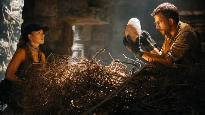 Fast forward to today, we are introduced to Shady Corporate Guy, who has a name, Martin Krebs, but it’s unimportant because Jurassic World is that kind of franchise now. He’s played by Rupert Friend (The Death of Stalin, The Phoenician Scheme) who doesn’t have to work very hard to come off as the slimy archetype he’s meant to play, showing utter exasperation at the traffic jam being caused by North America’s oldest known dinosaur slowly dying in the street. You see, despite the fact in the last movie, the dinosaurs were everywhere and threatening to Planet of the Apes-style take over, in the time between Jurassic World: Dominion and now, it turns out that dinosaurs really suck at living around humans and humans are very bored of dinosaurs, so the ones that haven’t died due to our climate being extremely different from the one their biology is designed for have retreated to the equatorial band, which prompts all the governments in the world to get together, have a few laughs, and ban all travel to the area over safety concerns. How wonderfully cooperative and realistic of them. But as it turns out, Krebs works for Big Pharma and he needs Zora Bennett, a former special operative, to go to this forbidden zone to get DNA from the three biggest dinosaurs in existence to cure heart disease. Zora, played by Scarlet Johansson uncomfortably in the Chris Pratt role, is hesitant to agree, but thankfully, like all problems in this world, Krebs solves it by throwing money at her until she agrees. She does get a bit nervy when she finds out that she needs to collect the DNA from living dinosaurs while they’re still alive. Walking Dinosaur Fact Book, also named Dr. Henry Loomis, played by Jonathan Bailey (Bridgerton, Wicked), explains exactly why they need it and that’s mostly his role in this movie. There are some good moments of diegetic exposition, where informational videos play contextually in the background and make sense for the scene, but when they can’t do that, Loomis is able to jump in and give the audience everything they need to know without any characters ever needing to earn any knowledge.