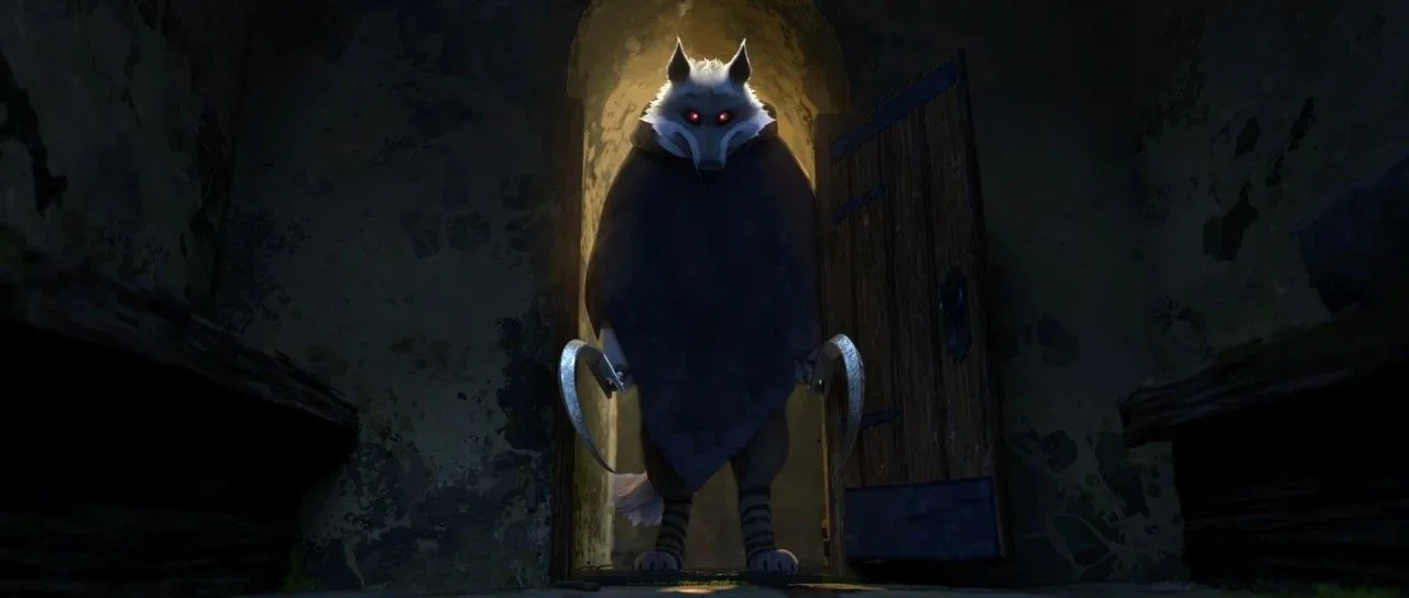 If I had nine lives, I’d probably have a chuckle myself, so when he wakes up in a doctor’s office and he reminds Boots that death comes for us all, Boots is understandably perturbed. I mean, keep it light, Doc. It’s a PG movie. Boots has died eight times, though; he’s down to his last guy. When drowning his sorrows alone with some frosty milk in a quiet bar, a whistle cuts through the night air. The Whistling Wolf sits next to him and is very friendly at first, despite his menacing appearance.
