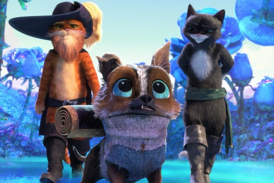 There’s a legend in fairy tale land about a shooting star that fell to Earth and created a magical forest around it, a sort of pocket dimension called the Dark Forest. It’s said that if you get to the star you will be granted a single wish. So when Goldilocks (Florence Pugh) and the three bears (Ray Winstone, Olivia Colman, Samson Kayo) show up to the cat sanctuary doing their best bull in a China shop impression and let it slip that they wanted Boots’s help stealing a map to the Wishing Star from Little Jack Horner (John Mulaney), Boots can’t help but figure that he can steal it for himself and use the wish to get his nine lives back. Not a bad plan. Along with him is that one small dog, Perrito (Harvey Guillén), and, boy it pains me to say this about a cartoon cat, his former lover Kitty Softpaws (Salma Hayek Pinault). But all through this adventure, the whistling specter of finality follows behind, always nipping at the backs of his paws.